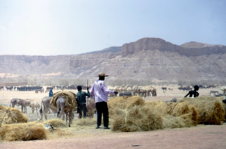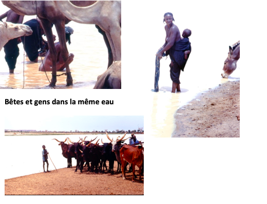 Nous nous immergions dans une population d’hommes et de bêtes qui tous souffraient des températures incroyables. Une multitude de choses étaient à vendre, les gens malgré tout s’y retrouvaient. Je remarquais un camion chargé de passagers, il semblait vrillé. Je finis par m’apercevoir, qu’il avait trois roues de camion classique, que la quatrième à l’arrière semblait être une roue de voiture ! Il roulait quand même avec, des dizaines de personnes à bord ainsi que du matériel, des sacs, des animaux. Au bord de la mare les troupeaux venaient boire, ils arrivaient parfois de loin. Les bergers les faisaient rentrer dans l’eau quelques minutes puis les obligeaient à ressortir. Les troupeaux restaient de longues minutes sur la berge, puis retournaient à l’eau. Ce principe était nécessaire pour éviter que les animaux ne se gavent. On m’avait raconté que des ânes semi-sauvages mouraient par asphyxiés par absorption brutale d’une trop grande quantité d’eau.