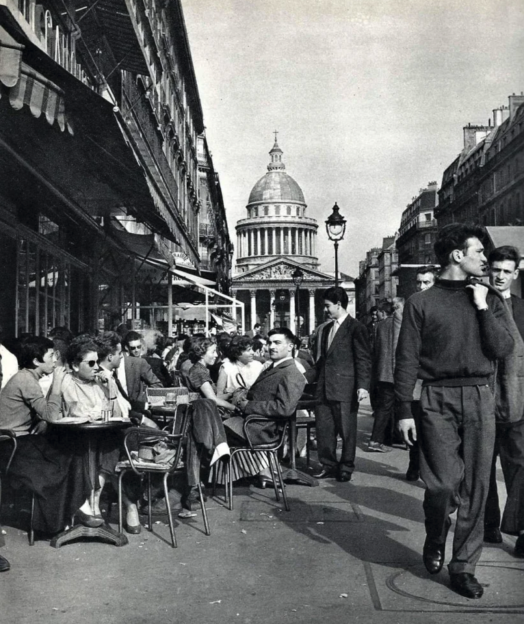 Voici une photographie de la terrasse du Capoulade au début des années 50. Le Capoulade était l’un des grands cafés du Quartier Latin. Situé au bas de la rue Soufflot à l’angle du Boulevard Saint-Michel, au soleil du matin au soir, il était préféré à celui d’en face, le Maheux, qui demeurait à l’ombre la plus grande partie de la journée.