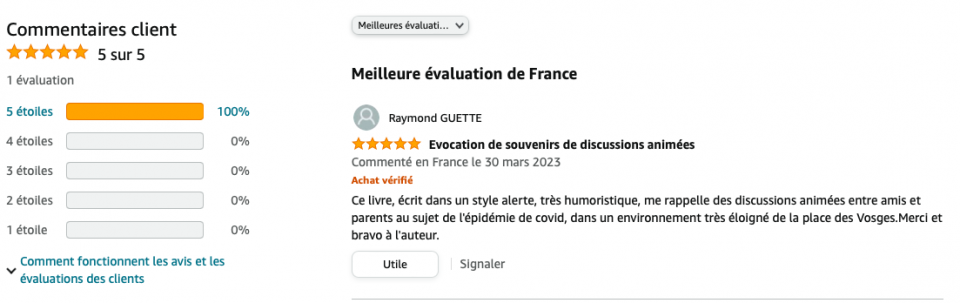 Par ailleurs, j’ai eu le grand plaisir de constater qu’un de mes camarades de promotion avait déposé un avis sur Amazon. En voici la capture d’écran :
