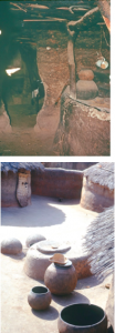 Le Tata se compose d’un grand mur d’enceinte tout en courbe d’une hauteur de 5 à 6m. Il entoure l’espace fermé du rez-de-chaussée et sert de garde de corps à la terrasse de l’étage, niveau réservé aux animaux, même aux abeilles ! Par une échelle rudimentaire, dans la fraicheur et le noir, dans une odeur forte de fumée, on accède au 1ierétage, lieu de vie de la famille. Il y a là, la cuisine avec la pierre meulière et le foyer, les chambres et les greniers à grains. L’ensemble recouvert de toits de paille était d’une grande propreté.