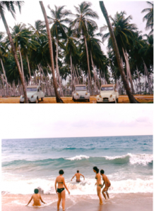 Il est plus de 14h et nous envisagions de sortir notre gamelle pour apaiser notre faim. Tout en logeant les cocotiers de la plage nous arrivions non loin de la frontière avec le Dahomey (Bénin). Un peu en retrait de la route nous remarquions une cabane de pécheur. Nous nous arrêtions et entendions le même refrain : que la mer est très mauvaise. Après un temps d’arrêt le patron nous dit « mais j’ai des langoustes ». Nous voilà assis dans le sable devant de la braise fumante sur laquelle cuisent six langoustes, accompagnées de riz à la togolaise et de la bonne bière. Un festin dont nous nous souvenons encore !