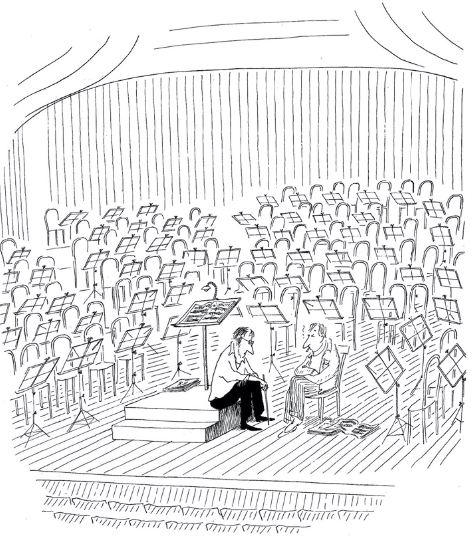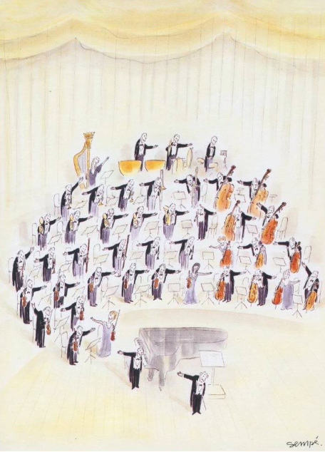 ou avec paroles, simples ou en séries, sont toujours d’admirables leçons de vie et de compréhension de notre société, leçons toujours données avec humour, tact et humanité, toujours vraies, caricaturant les plus humbles comme les plus importants. C’est ainsi que Sempé a plusieurs fois caricaturé l’orchestration musicale, c’est-à-dire le mariage réussi – sans chercher à jouer sur les mots – entre la composition musicale elle-même, une symphonie composée par Beethoven par exemple, et celle, indispensable, de l’orchestre qui l’interprète, laquelle réside dans la participation parfaite de chaque instrument à l’harmonie globale de l’ensemble. Le triangle par exemple, instrument humble par excellence, Sempé lui restitue sa part de noblesse à l’égale de tous les autres instruments de l’orchestre. Et puis, il y a le rôle fondamental du chef sans lequel un orchestre, comme tout ensemble collectif humain, serait voué à la cacophonie et la déconfiture. Chapeau Monsieur Sempé !