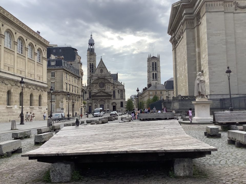 Cet aménagement, plutôt réussi et pour un cout probablement raisonnable, donne à cette place un aspect jeune, estival et studieux, ce qui est la moindre des choses quand on considère qu’à proximité quasi immédiate se trouvent la Bibliothèque Sainte Geneviève, les Lycées Henri IV, Louis le Grand, Saint Louis, la fac de droit, la Sorbonne, Normale Sup, les Arts Déco, l’École des Mines et j’en oublie sûrement.