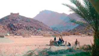 Nous roulons dans une vallée étroite et passons devant un petit cimetière, le contour des tombes est matérialisé par des pierres, certaines étant verticales. Peu à peu la vallée s’élargit et nous arrivons dans la superbe oasis de Timia, avec une végétation luxuriante. On peut apercevoir sur un promontoire un gros bâtiment à son sommet. On est aussi surpris par le grincement incessant d’une poulie qui raisonne dans toute la vallée.