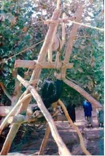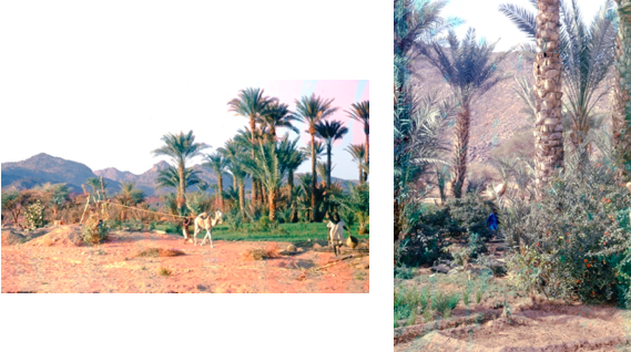 Nous sommes étonnés par la variété de cultures qui y poussent sur de petites parcelles de quelques m2 encadrées de petits canaux. On y trouve du blé, des oignions, des légumes divers, des plantes aromatiques… L’ensemble est ombragé par de grands palmiers-dattiers. L’eau pour l’arrosage provient de puits, d’ où elle est extraite à l’aide d’un système astucieux, ne nécessitant la présence que d’une seule personne: il s’agit d’une noria à vidange automatique. L’ensemble fait de bois supportant une poulie autour de laquelle est enroulée une longue corde qui va puiser l’eau à des dizaines de mètres à l’aide d’une outre en cuir d’une trentaine de litres. La traction est effectuée par un dromadaire ou une vache conduit généralement par un enfant et là, la poulie se met à grincer. L’extrémité basse de l’outre a la forme d’un entonnoir dont le bec est relevé pendant la remontée. Il débouche dans une goulotte de bois, point haut du réseau d’arrosage et se vide.