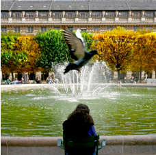 En quittant X. et la Brasserie Mollard, il me prit l’envie de passer par les Jardins du Palais Royal. Comme je ne compte plus trop sur ma seule mémoire, j’ai fait appel par précaution aux photos que j’avais prises et qui sont mon bloc-notes. Cette démarche ne s’est pas avérée inutile : j’avais complètement oublié ma rencontre avec le seul pigeon intelligent de Paris. En réalité, je ne l’avais pas vu mais il est passé devant moi au moment où je déclenchais. Par un coup de chance cher à Cartier-Bresson, il était dans la bonne position, pile au centre, et les ailes déployées vers le haut alors que, déployées vers le bas, elles rendent tous les volatiles hideux. Allez, puisque c’est vous, je vais vous le montrer. Pas mal le pigeon, non ?