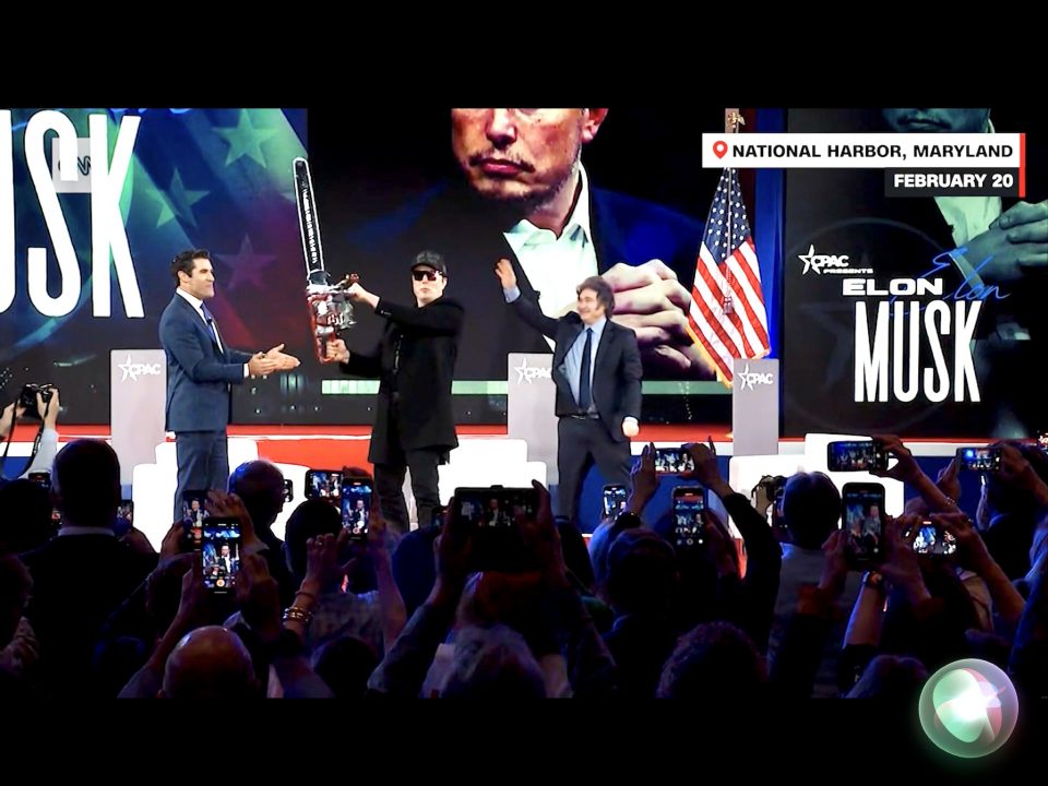 Cette photo, pourtant saisissante, reflète mal le climat d’excitation et même de transe dans lequel baignait cette exhibition. Il fallait entendre Musk littéralement rugir tandis qu’il pourfendait l’espace avec la tronçonneuse offerte par Javier Milei, le président de l’Argentine. Il fallait aussi entendre les hurlements de joie de l’assistance extatique.