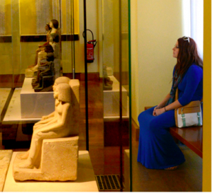 La première correspondance fut celle d’une femme à la robe bleue mimant inconsciemment les sculptures égyptiennes exposées devant elle.