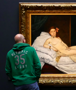 La seconde montre aussi le seul accommodement que je me suis permis, celui de suivre un visiteur qui ne manquerait pas de faire une bonne photo s’il allait voir la peinture correspondante. Ce fut le cas avec cet homme dont le sweater portait le mot Olympic en caractères majuscules. Il venait d’entrer dans la salle du Musée d’Orsay où je savais qu’il y avait l’Olympia de Manet. Non seulement il est allé la voir mais, en plus, il s’est immobilisé de longues minutes devant elle.