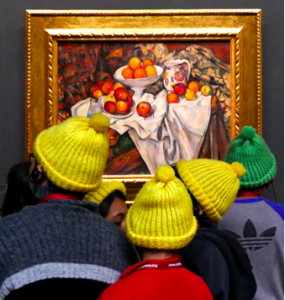 Un jour, je quittai la salle des Impressionnistes à Orsay au moment où y entrait une classe dont les élèves portaient un bonnet jaune ou vert pour permettre de les retrouver plus facilement s’ils se perdraient. Au sommet de chaque bonnet, il y avait un pompon. Je rebroussai chemin et les suivis, espérant qu’ils iraient s’appareiller avec une peinture. Je fus exaucé au-delà de l’imaginable puisqu’ils s’installèrent devant les Oranges et les Pommes de Paul Cézanne.