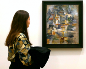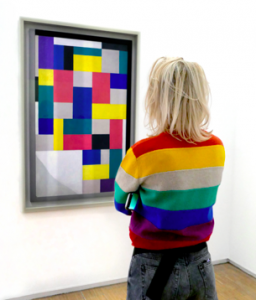 Comme toujours en photo, il faut de la chance pour qu’elle soit réussie. Une double chance même : celle de voir les analogies entre visiteurs et tableaux et celle de réussir à les photographier. Au début, je ressentais une terrible frustration quand le visiteur s’était éloigné du tableau avant mon arrivée. Avec le temps, je suis devenu fataliste : une de perdue, dix de retrouvées … Je me suis toujours interdit de lui demander de revenir en arrière pour faire ma photo, sauf une fois et une seule, et je ne le regrette pas. Il s’agit de la jeune femme devant la toile de Theo van Doesburg au Centre Pompidou. La principale difficulté avait été l’obstacle de la langue car elle était étrangère et ne comprenait pas ce que je lui demandais.