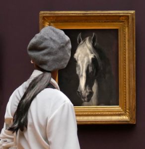 Il m’arrive de prendre des photos par intuition sans en connaître la raison qui ne m’apparaîtra que plus tard. Il m’arrive aussi de prendre une photo pour une analogie particulière et lui en découvrir ensuite une autre beaucoup plus forte. Ce fut le cas avec Le Cheval de Géricault où l’analogie de couleurs a laissé la place à une autre analogie que je n’avais pas vue sur le coup : la queue de cheval grise de la visiteuse aurait très bien pu être celle du cheval qu’il aurait perdue un jour par accident.