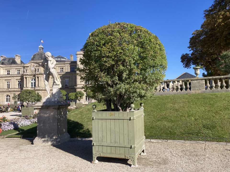 Le coin avait sans doute été choisi avec soin : à l’abri du vent du Nord sous la balustrade de pierre qui limite la terrasse coté Médicis, exposé Sud—Sud-Ouest dans l’arrondi d’un talus gazonné et donc parfait pour le bain de soleil, placé dans le virage d’accès au bassin centre de gravité du jardin, c’était un point névralgique d’observation qui permettait de ne rater personne et d’être vu de tout le monde.