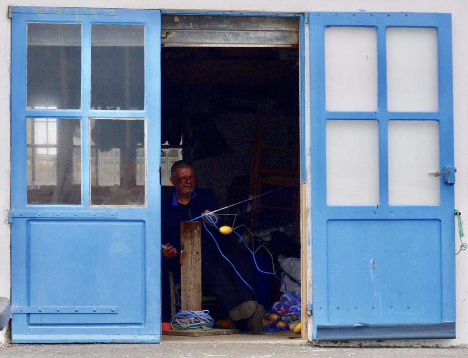 Mais que fait ce monsieur dans ce joli encadrement d’un bleu qui fait rêver, le bleu de la mer méditerranée, tout un programme ! Je pense qu’il répare un filet de pêche ?