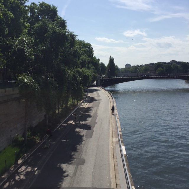 Ce matin-là, pas plus tard qu’il y a deux jours, vers 11h22 du matin, je passais sur le pont Notre-Dame. Il faisait beau et déjà un peu chaud. Pour vous, mes lecteurs, qui n’avez pas la chance inouïe de vivre à Paris, du haut du pont, j’ai pris cette photo de la voie sur berge. Sur la gauche, vous pourrez admirer les magnifiques aménagements, dans le style « herbes folles », apportés par notre Mairie pour l’agrément des promeneurs et, sur la droite, la foule qu’ils ont attirée. Par pur souci d’esthétique, je n’ai pas souhaité que figurent sur la même photo les encombrements concomitants du quai de Gesvres.