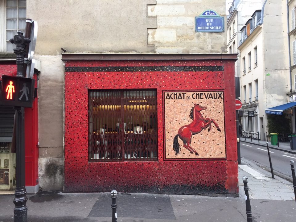 « Achat de chevaux », et ce commerce se trouve rue du Roi de Sicile. J’espère qu’icelui est moins radin que le roi de Prusse et aussi généreux que le roi d’Angleterre Richard III dont Shakespeare lui fait dire « Un cheval! Un cheval! Mon royaume pour un cheval! »