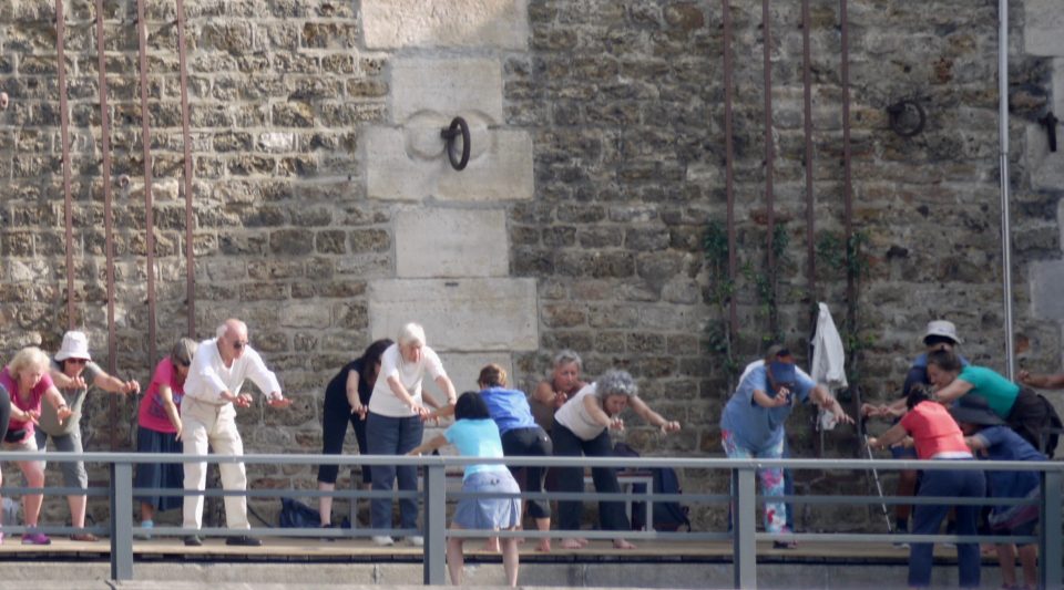 Ah oui! J’ai vu ça aussi aux Buttes Chaumont. Est arrivée déguisée en gardien de square, se cachant d’arbre en arbre, la mairesse ibère le képi de travers, qui a soufflé dans son sifflet à la force 7 à en faire péter son soutif, puis a crié d’une voie hystérique ‘on ne joue pas sur le gazon, caramba!’. Moi uje lui ai dit en chantant ‘on est pas là pour se faire engueuler’.