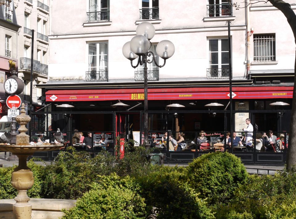 En dehors de sa clientèle, le Café Delmas présente l’avantage d’une grande terrasse exposée plein sud et donnant la vue sur un tout petit square dont on aperçoit la minuscule fontaine sur la photo.