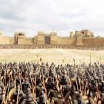 Et les Achéens chevelus s’armaient, ayant mangé en hâte sous les tentes ; et les Troyens aussi s’armaient dans la ville ; et ils étaient moins nombreux, mais brûlants du désir de combattre, par nécessité, pour leurs enfants et pour leurs femmes. Et les portes s’ouvraient, et les peuples, fantassins et cavaliers, se ruaient au dehors, et il s’élevait un bruit immense.