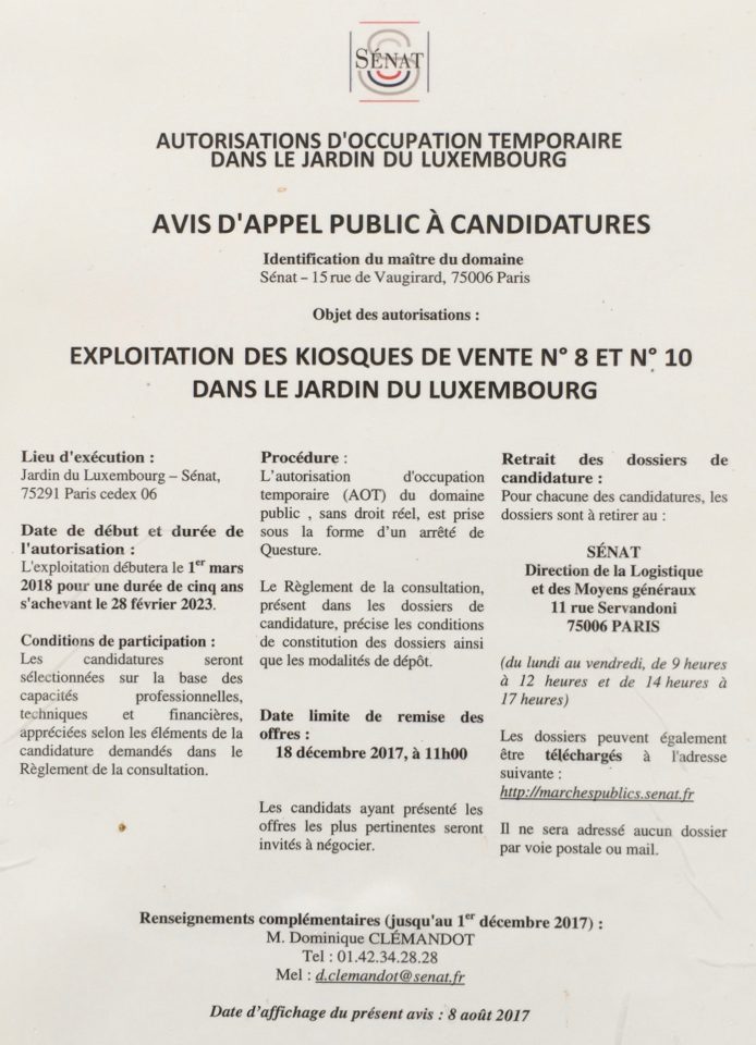 Bonne nouvelle : le Sénat donne à exploiter deux kiosques de vente. Voir ci-dessous les conditions de candidature :