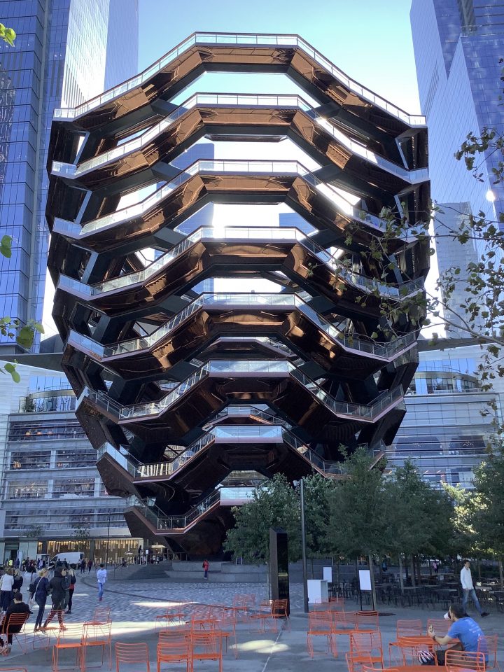 Le Vessel est une structure de 46 mètres de hauteur qui se dresse dans Manhattan au milieu du nouveau quartier de Hudson Yards à l’extrémité Nord de la fameuse High Line. Elle comporte 154 escaliers, 2500 marches et 80 plateformes, le tout accessible au public. La forme étrange relève
